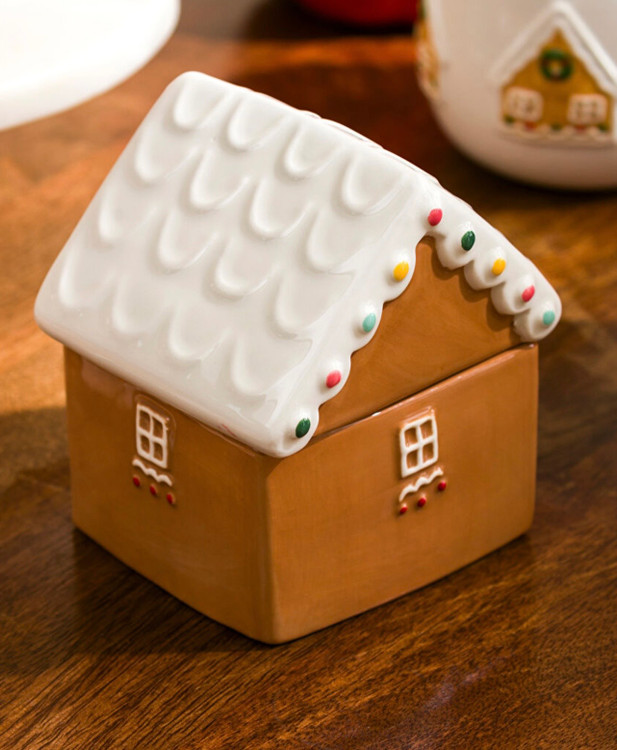 این بانکه سرامیکی زیبا با طراحی خانهی شیرینی، الهامگرفته از حالوهوای گرم و دلنشین کریسمس، انتخابی جذاب برای دکور آشپزخانه یا میز پذیرایی است. جزئیات ظریف طرح، شامل سقف سفید شبیه به خامه و تزیینات رنگی، جلوهای فانتزی و دوستداشتنی به این محصول بخشیده است.