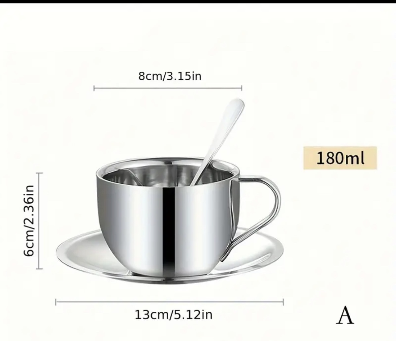 .برند: شین .جنس:استیل .۱۸۰ میلی لیتر . ابعاد فنجان:۶ سانتی متر * ۸ سانتی متر .ابعاد نعلبکی:۱۳ سانتی متر